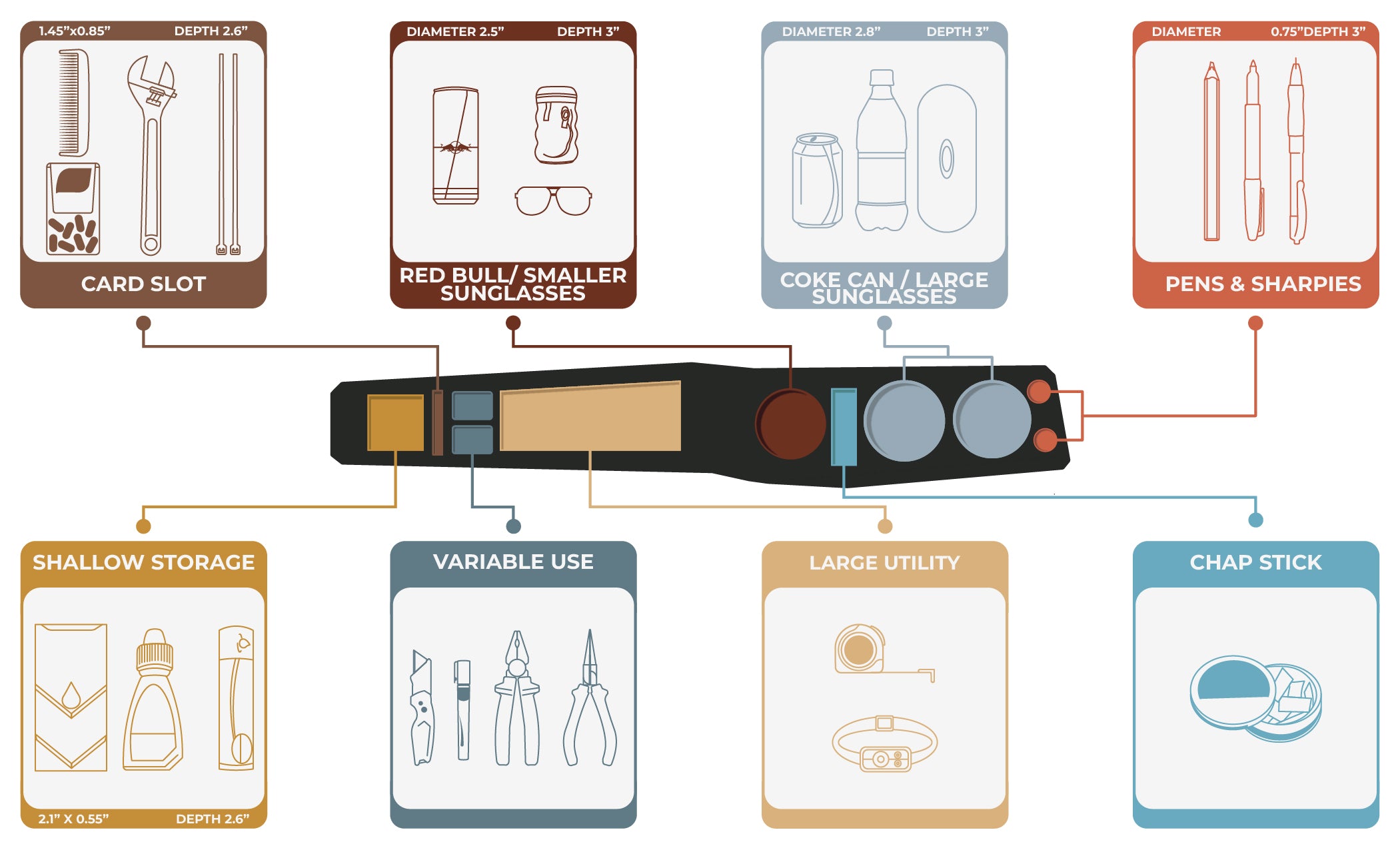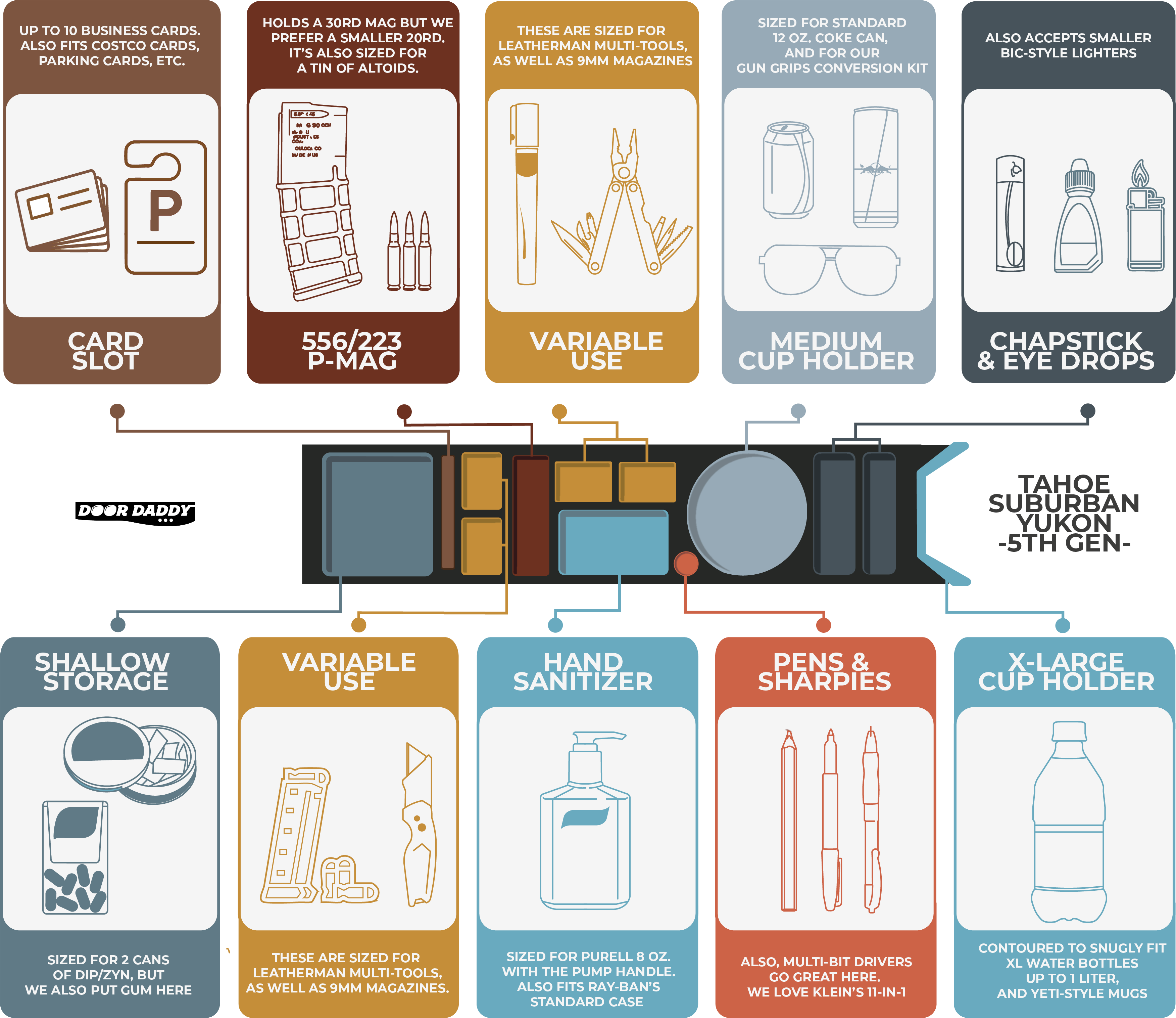 The product descriptions say things like “store beverages, tools, or personal items … custom compartments that keep everything in place, even on rugged terrain.